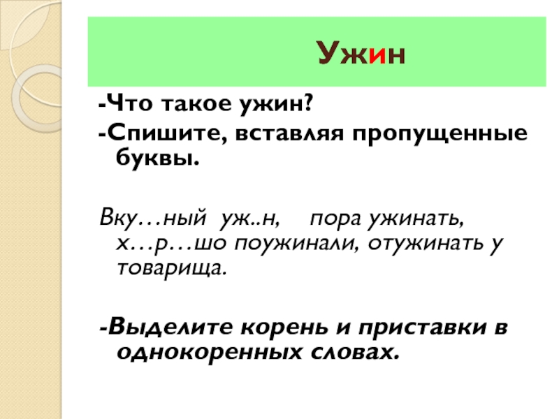 Вку…ный уж..н, пора ужинать, х…р…шо поужинали, отужинать у товарища.