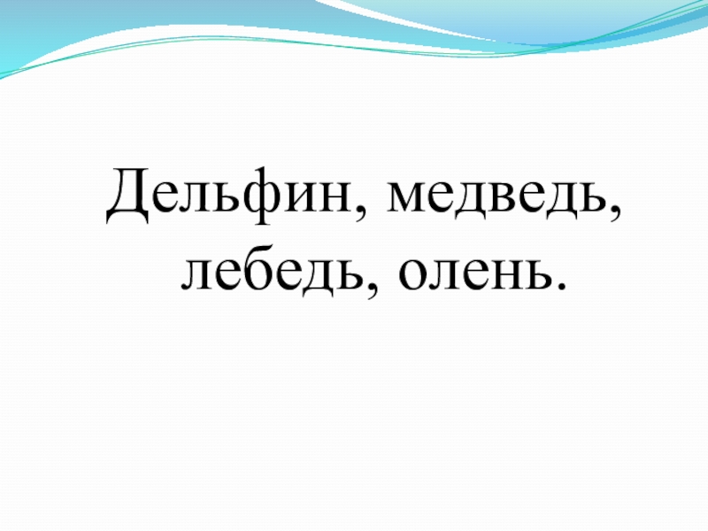Дельфин, медведь, лебедь, олень.