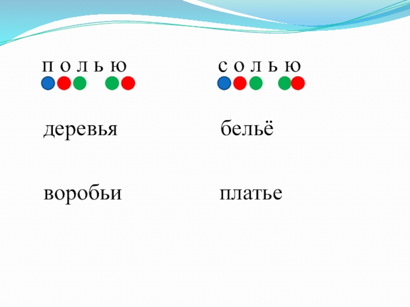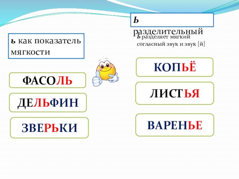 ФАСОЛЬКОПЬЁЛИСТЬЯДЕЛЬФИНЗВЕРЬКИВАРЕНЬЕь как показатель мягкости Ь разделительныйЬ разделяет мягкий согласный звук и звук [й]