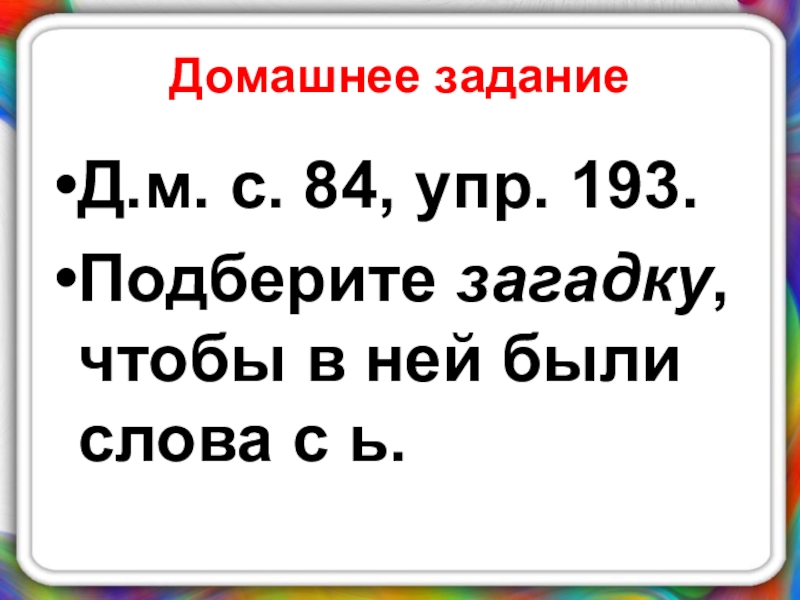 Домашнее заданиеД.м. с. 84, упр. 193.Подберите загадку, чтобы в ней были слова с ь.