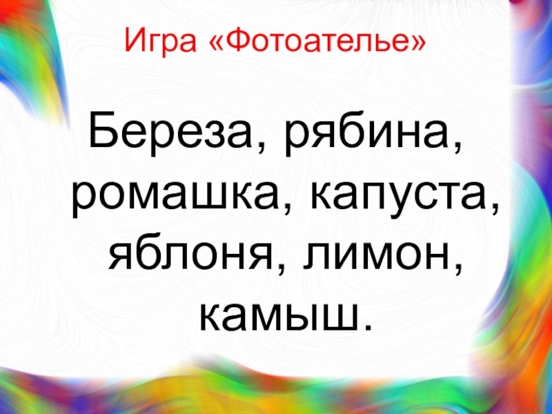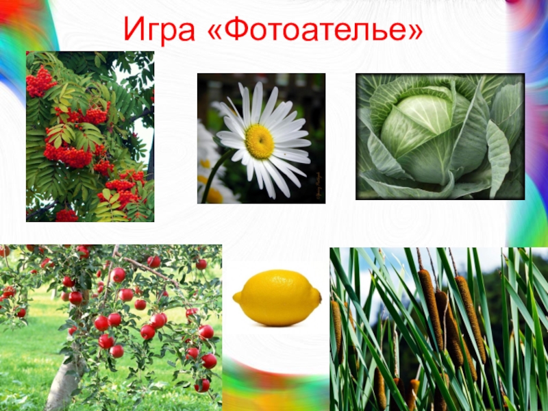 Игра «Фотоателье»Береза, рябина, ромашка, капуста, яблоня, лимон, камыш.