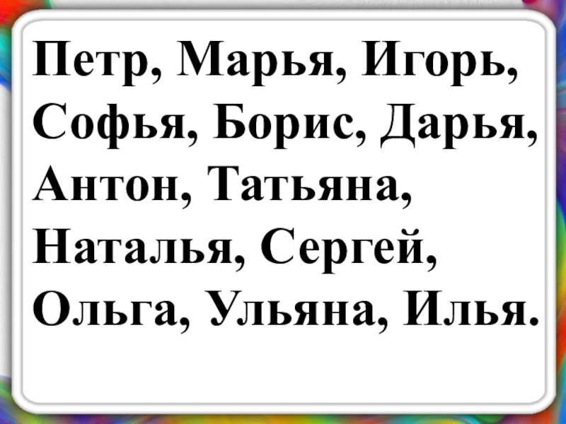 Слайд 8Петр, Марья, Игорь, Софья, Борис, Дарья, Антон, Татьяна, Наталья, Сергей, Ольга,