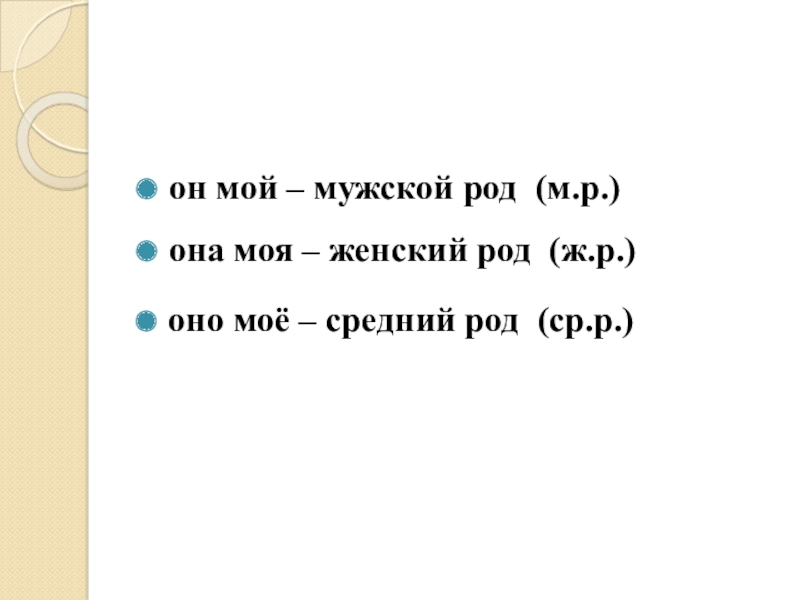 он мой – мужской род (м.р.)она моя – женский род (ж.р.)оно моё – средний род (ср.р.)
