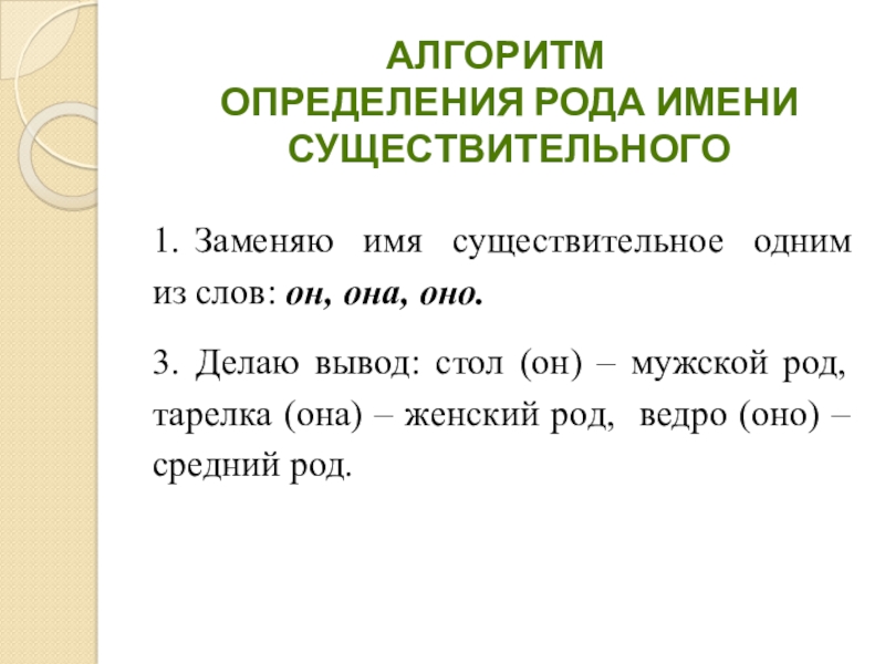 Алгоритм  определения рода имени существительного1. Заменяю имя существительное одним  из слов: он, она, оно. 3.