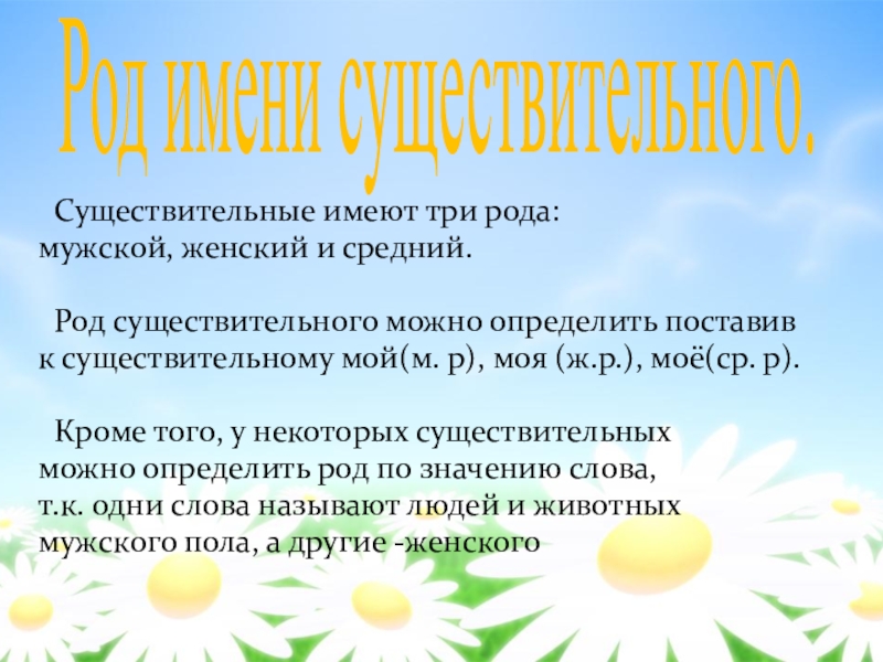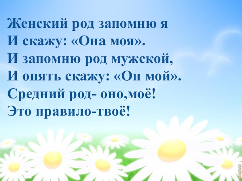 Женский род запомню яИ скажу: «Она моя».И запомню род мужской,И опять скажу: «Он мой».Средний род- оно,моё!Это правило-твоё!