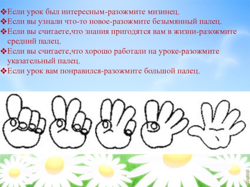 Если урок был интересным-разожмите мизинец.Если вы узнали что-то новое-разожмите безымянный палец.Если вы считаете,что знания пригодятся вам в