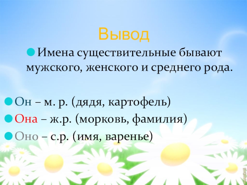 ВыводИмена существительные бывают мужского, женского и среднего рода.Он – м. р. (дядя, картофель)Она – ж.р. (морковь, фамилия)Оно