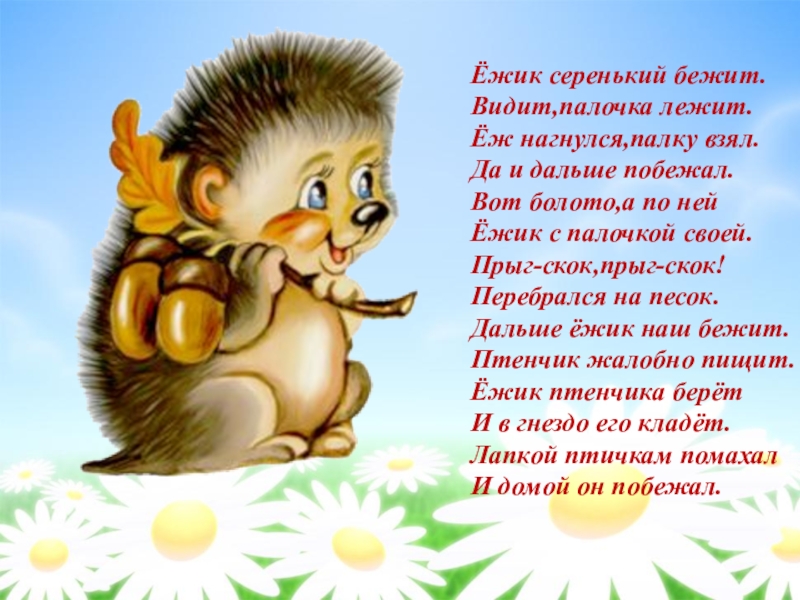 Ёжик серенький бежит.Видит,палочка лежит.Ёж нагнулся,палку взял.Да и дальше побежал.Вот болото,а по нейЁжик с палочкой своей.Прыг-скок,прыг-скок!Перебрался на