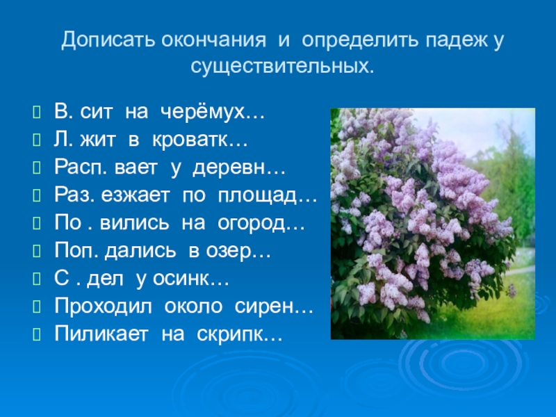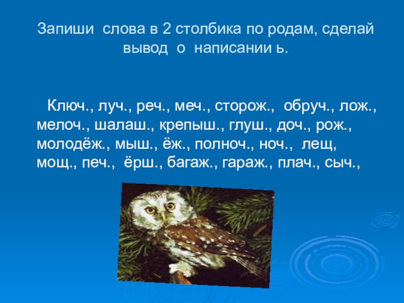 Ключ., луч., реч., меч., сторож., обруч., лож.,мелоч., шалаш., крепыш., глуш., доч., рож., молодёж., мыш., ёж., полноч., ноч., лещ, мощ., печ., ёрш., багаж., гараж., плач., сыч.,