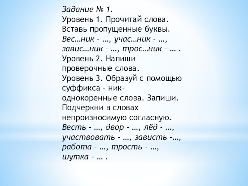 Уровень 3. Образуй с помощью суффикса – ник- однокоренные слова. Запиши. Подчеркни в словах непроизносимую согласную.