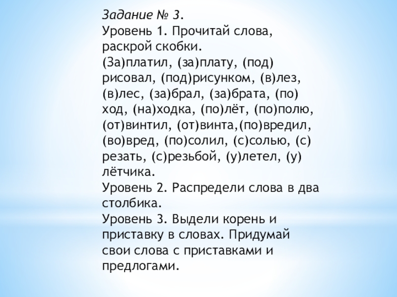 Уровень 3. Выдели корень и приставку в словах. Придумай свои слова с приставками и предлогами.