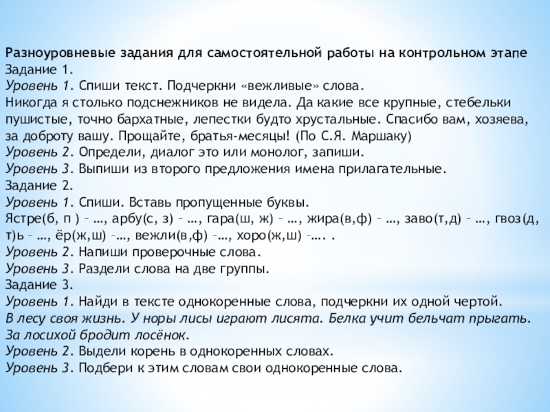 Слайд 6Разноуровневые задания для самостоятельной работы на контрольном этапе