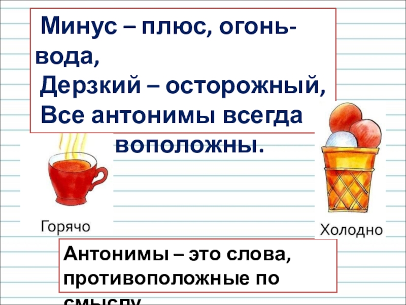 Минус – плюс, огонь-вода, Дерзкий – осторожный, Все антонимы всегда Противоположны.Антонимы – это слова, противоположные по