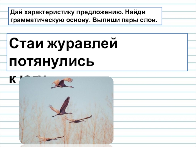Стаи журавлей потянулись к югу.Дай характеристику предложению. Найди грамматическую основу. Выпиши пары слов.