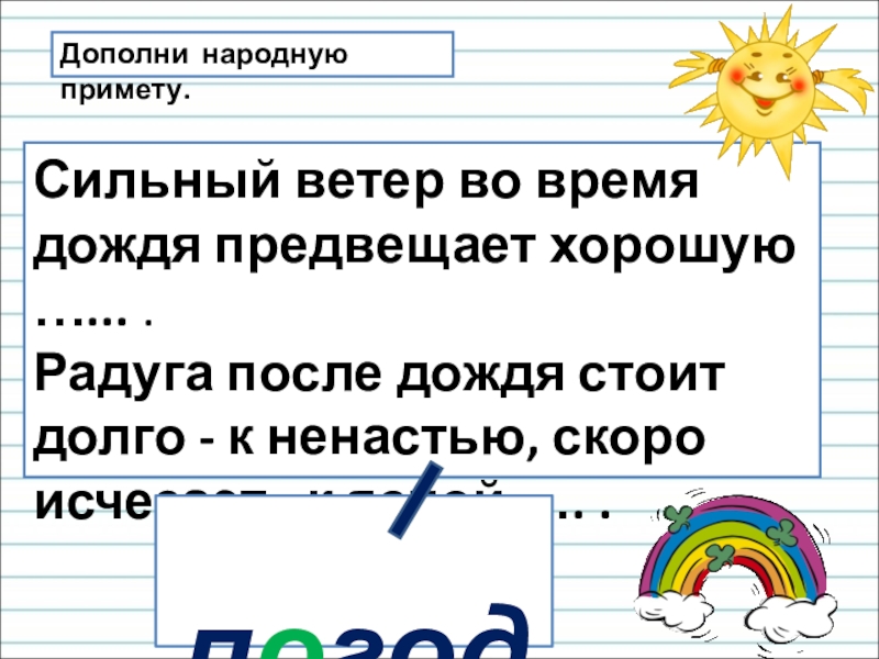 Дополни народную примету.Сильный ветер во время дождя предвещает хорошую …... .Радуга после дождя стоит долго - к