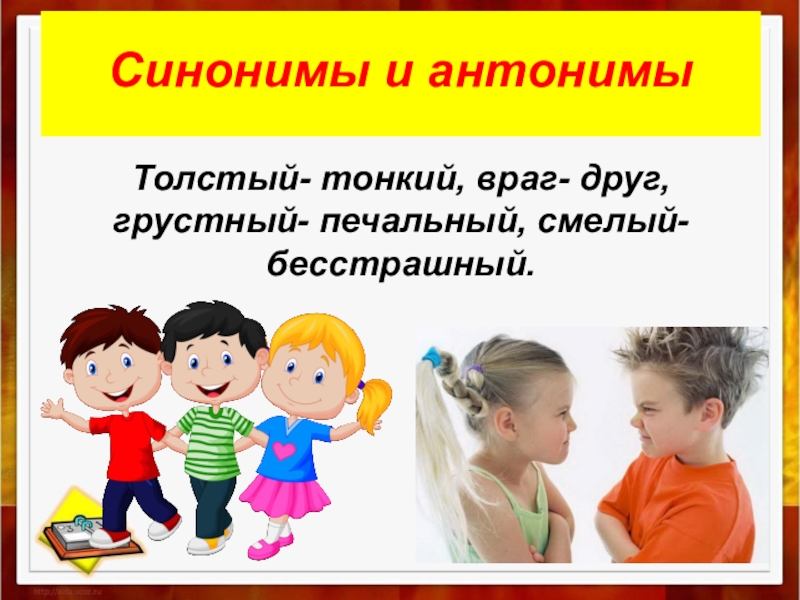 Синонимы и антонимы  Толстый- тонкий, враг- друг, грустный- печальный, смелый-бесстрашный.