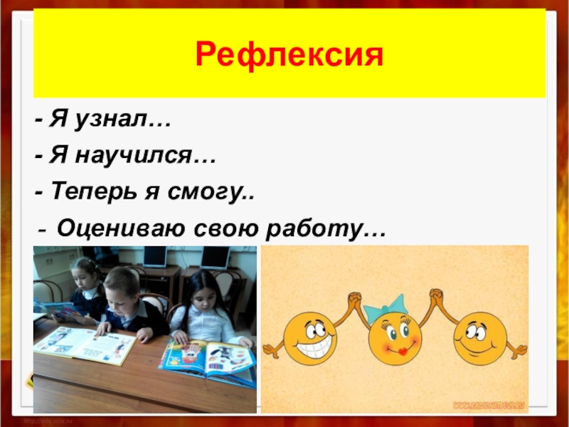 Рефлексия- Я узнал…- Я научился…- Теперь я смогу..Оцениваю свою работу…