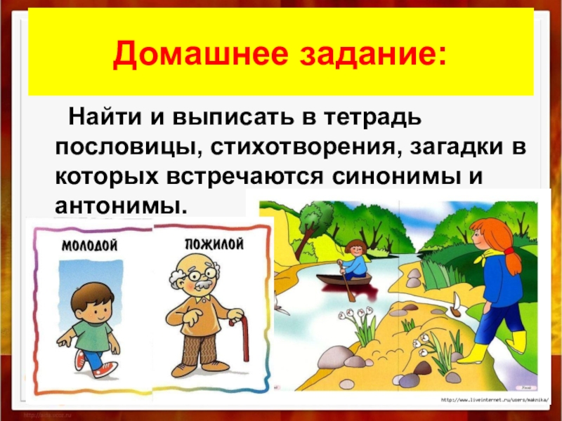 Домашнее задание:   Найти и выписать в тетрадь пословицы, стихотворения, загадки в которых встречаются синонимы и