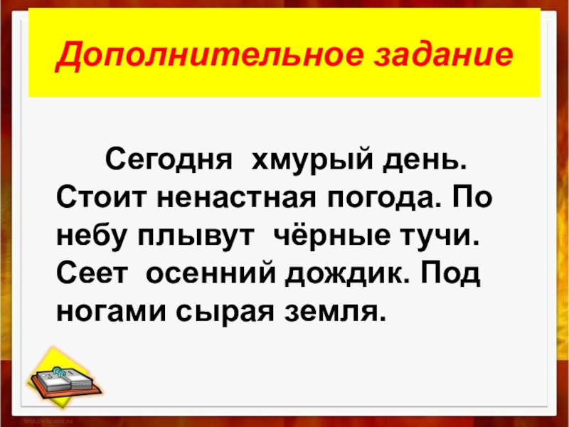 Дополнительное задание     Сегодня хмурый день. Стоит ненастная погода. По небу плывут чёрные тучи.