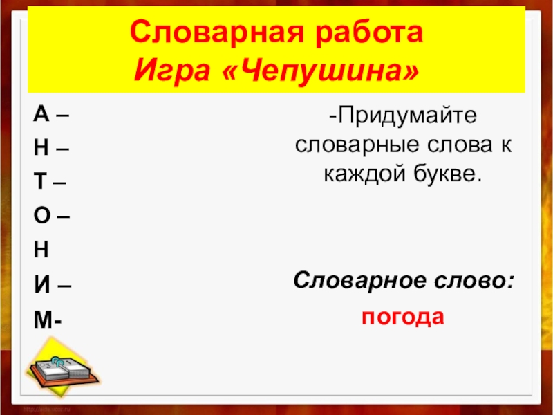 Словарная работа Игра «Чепушина»А – Н – Т –О –НИ –М--Придумайте словарные слова к каждой букве.Словарное слово:погода