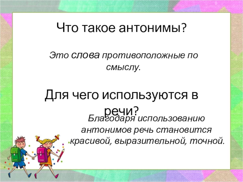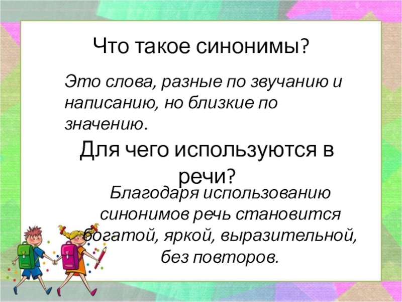 Благодаря использованию синонимов речь становится богатой, яркой, выразительной, без повторов.