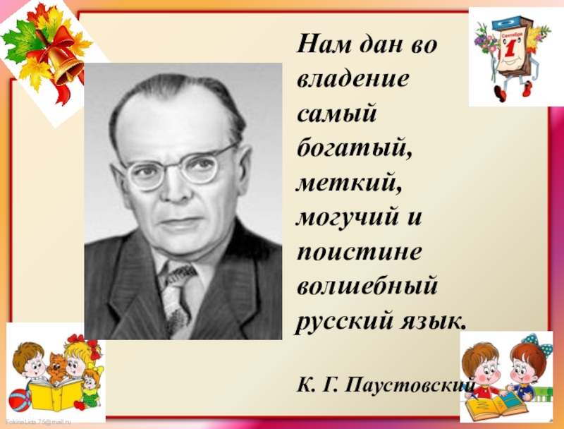Нам дан во владение самый богатый, меткий, могучий и поистине волшебный русский язык. К. Г. Паустовский