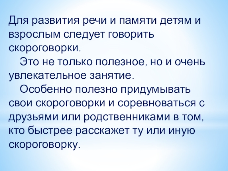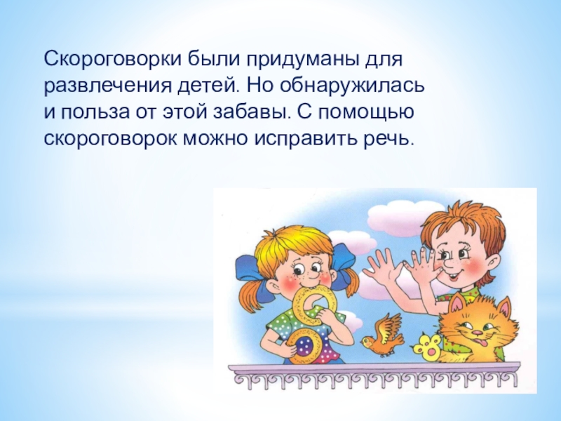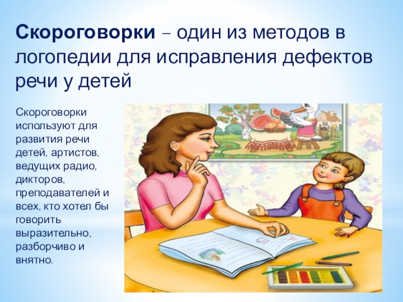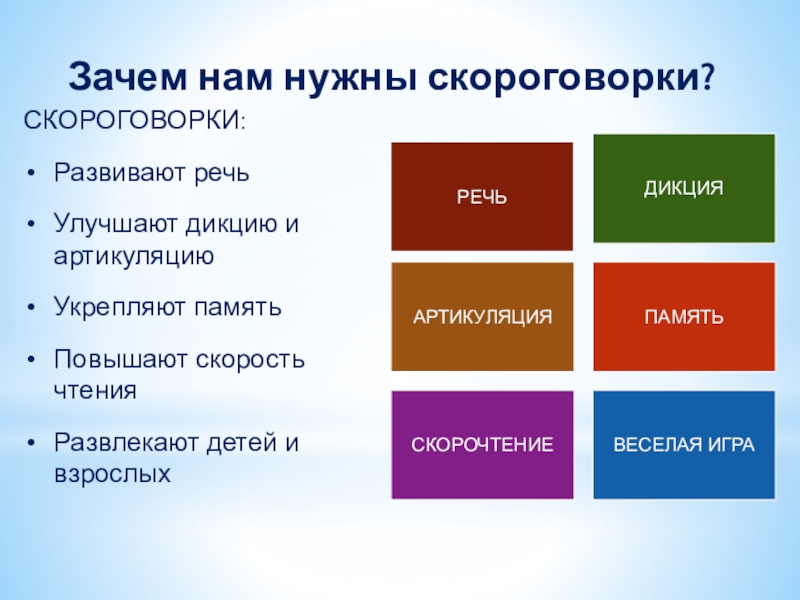 Скороговорки используют для развития речи детей, артистов, ведущих радио, дикторов, преподавателей и всех, кто хотел бы говорить выразительно, разборчиво и внятно.