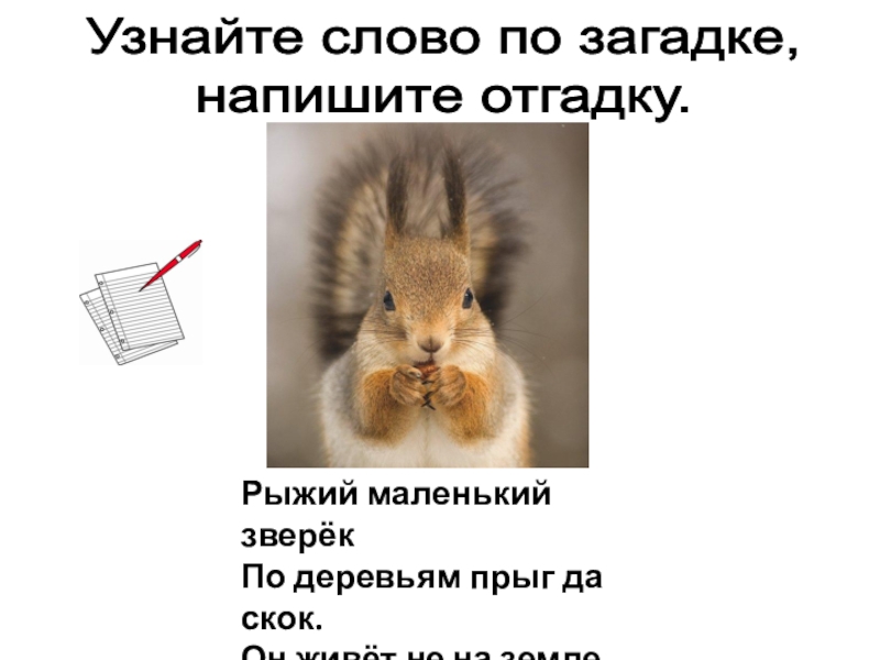 Узнайте слово по загадке,напишите отгадку.Рыжий маленький зверёк По деревьям прыг да скок. Он живёт не на земле,