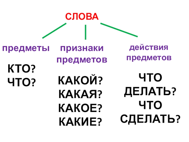 предметыпризнакипредметовдействияпредметовСЛОВАКТО?ЧТО?КАКОЙ?КАКАЯ?КАКОЕ? КАКИЕ?ЧТО ДЕЛАТЬ?ЧТО СДЕЛАТЬ?