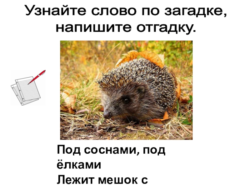 Узнайте слово по загадке,напишите отгадку.Под соснами, под ёлками  Лежит мешок с иголками.
