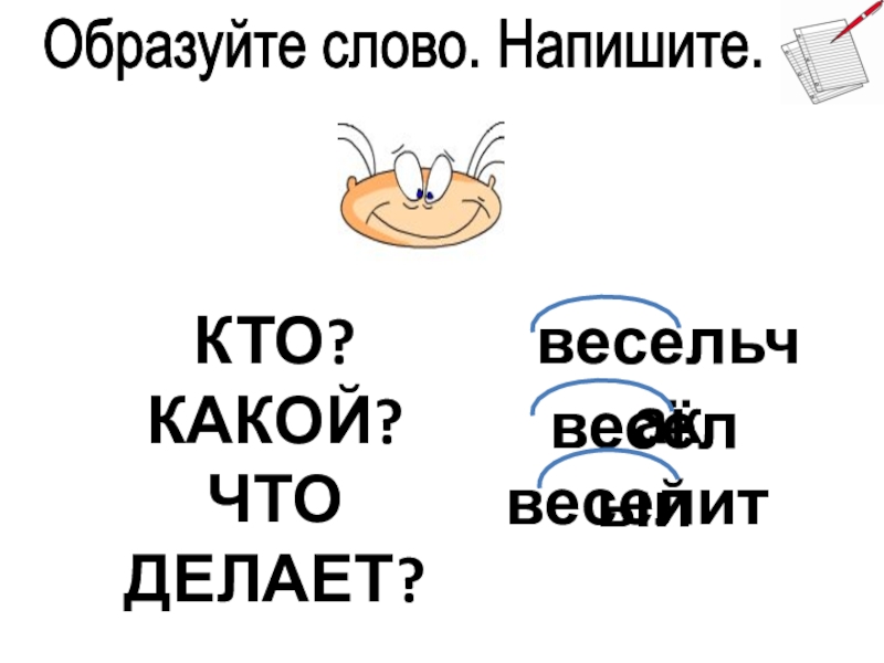 КТО?КАКОЙ? ЧТО ДЕЛАЕТ?Образуйте слово. Напишите.веселитвесельчаквесёлый