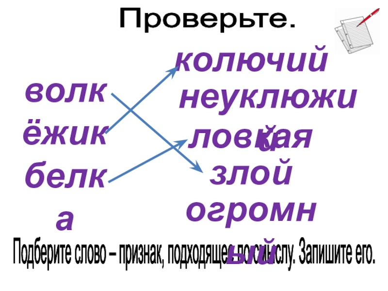 Проверьте.волкёжик белкаПодберите слово – признак, подходящее по смыслу. Запишите его.колючийнеуклюжийловкаязлойогромный