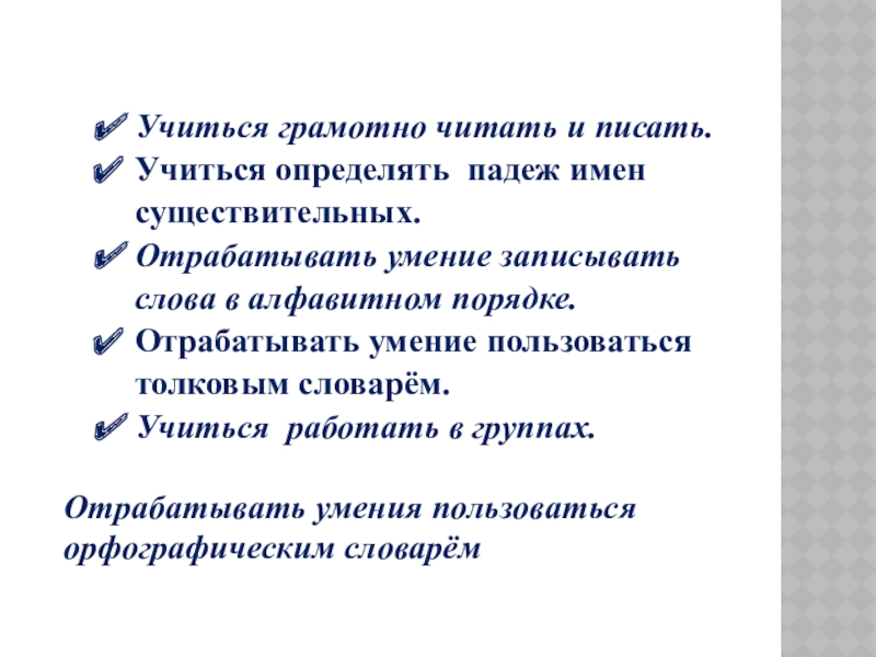 Учиться грамотно читать и писать.Учиться определять падеж имен существительных.Отрабатывать умение записывать слова в алфавитном порядке.Отрабатывать умение пользоваться