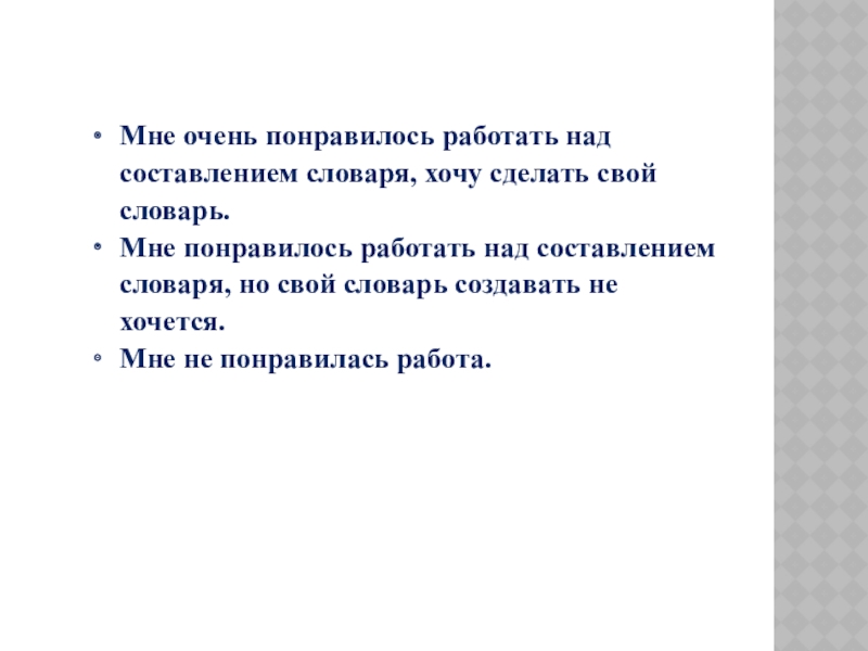 Мне очень понравилось работать над составлением словаря, хочу сделать свой словарь.Мне понравилось работать над составлением словаря, но