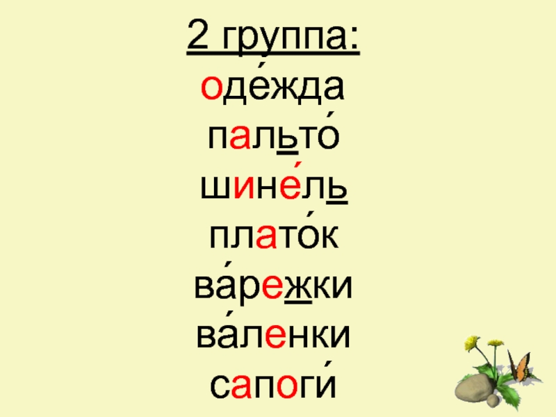 2 группа: оде́жда пальто́ шине́ль плато́к ва́режки ва́ленки сапоги́