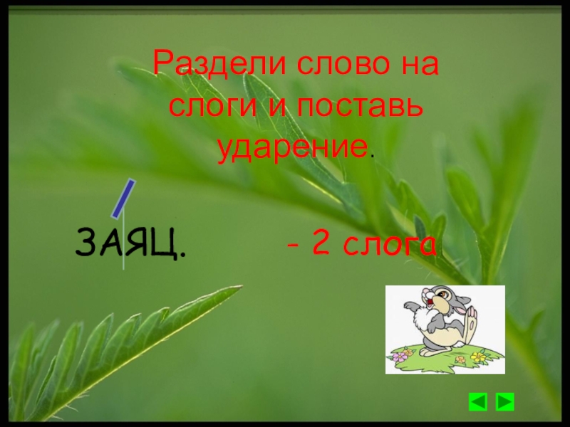Раздели слово на слоги и поставь ударение.ЗАЯЦ.- 2 слога