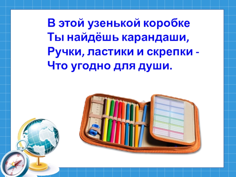 В этой узенькой коробкеТы найдёшь карандаши,Ручки, ластики и скрепки -Что угодно для души.
