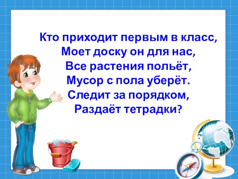 Слайд 8Кто приходит первым в класс, Моет доску он для нас, Все растения польёт, Мусор