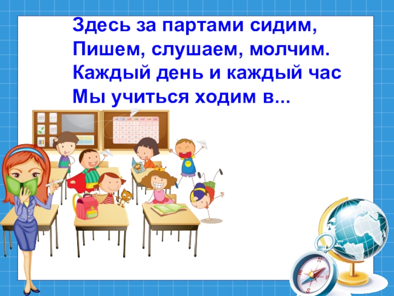 Здесь за партами сидим, Пишем, слушаем, молчим.Каждый день и каждый час Мы учиться ходим в...