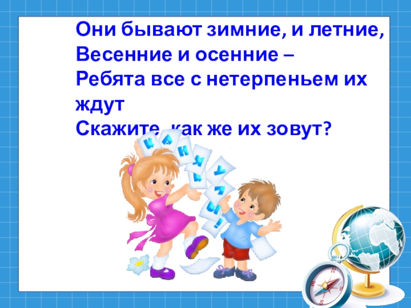 Они бывают зимние, и летние, Весенние и осенние – Ребята все с нетерпеньем их ждутСкажите, как же их зовут?