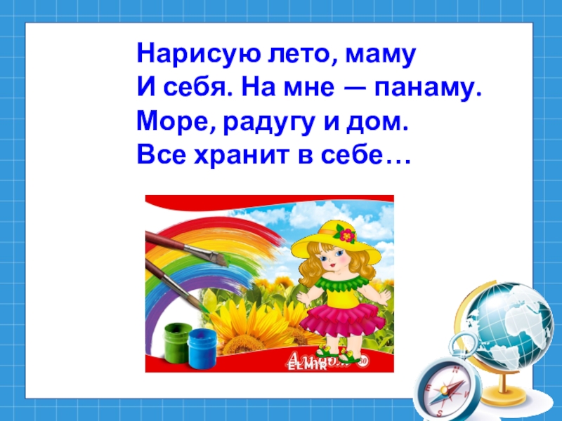 Слайд 6Нарисую лето, маму И себя. На мне — панаму. Море, радугу и дом. Все