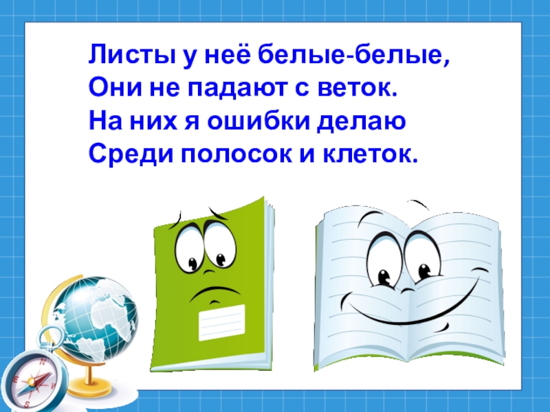 Листы у неё белые-белые,Они не падают с веток.На них я ошибки делаюСреди полосок и клеток.