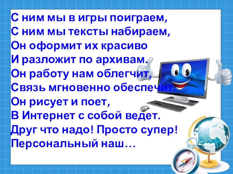 их красиво И разложит по архивам. Он работу нам облегчит, Связь мгновенно обеспечит. Он рисует и поет, В Интернет с собой ведет. Друг что надо! Просто супер! Персональный наш…