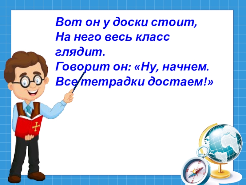 Вот он у доски стоит, На него весь класс глядит. Говорит он: «Ну, начнем. Все тетрадки достаем!»