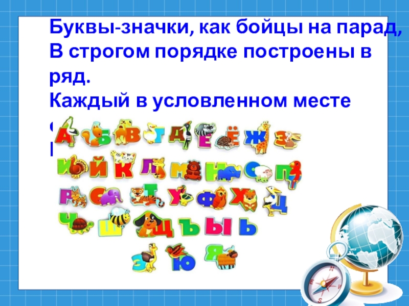 Слайд 13Буквы-значки, как бойцы на парад, В строгом порядке построены в ряд. Каждый в