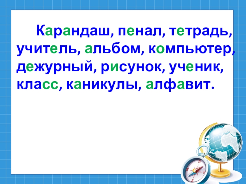 Карандаш, пенал, тетрадь, учитель, альбом, компьютер, дежурный, рисунок, ученик, класс, каникулы, алфавит.