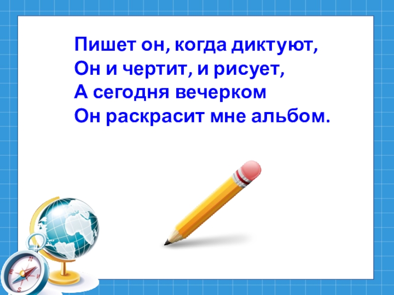 Пишет он, когда диктуют,Он и чертит, и рисует,А сегодня вечеркомОн раскрасит мне альбом.