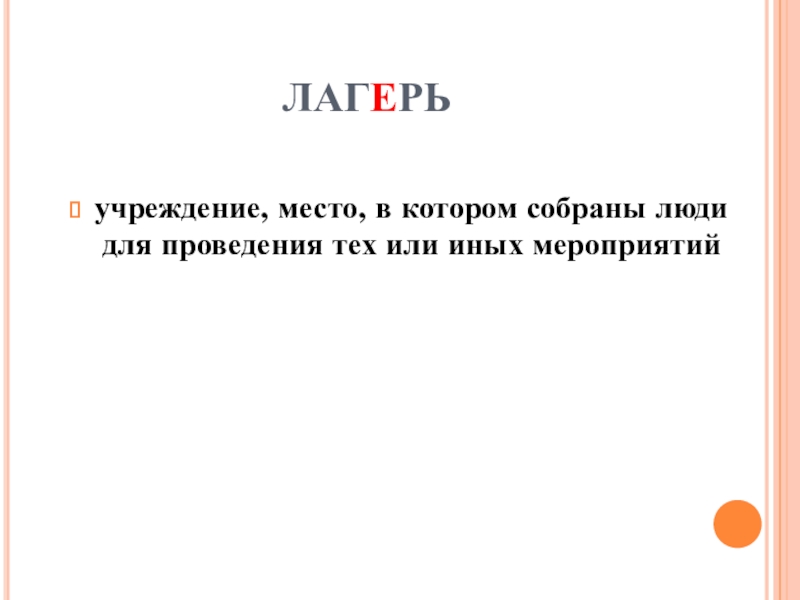 лагерьучреждение, место, в котором собраны люди для проведения тех или иных мероприятий