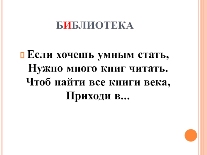 библиотекаЕсли хочешь умным стать, Нужно много книг читать. Чтоб найти все книги века, Приходи в...