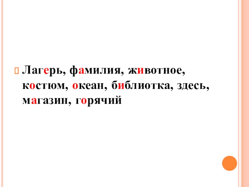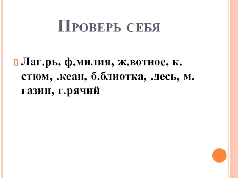 Проверь себяЛаг.рь, ф.милия, ж.вотное, к.стюм, .кеан, б.блиотка, .десь, м.газин, г.рячий